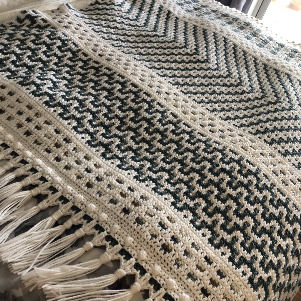 I’ve seen some really beautiful examples of this blanket worked in all sorts of colors. Most notably was a creator whose MC was a bright teal, and their C1 was a rich coral color. Playing with the colors on this blanket can absolutely transform it, and it is very easy to put your own personal touch on it. I have also seen a lot of crocheters who are not fans of tassels omit them completely and either finish the blanket with a SC border around the whole thing, or create their own edging entirely.
