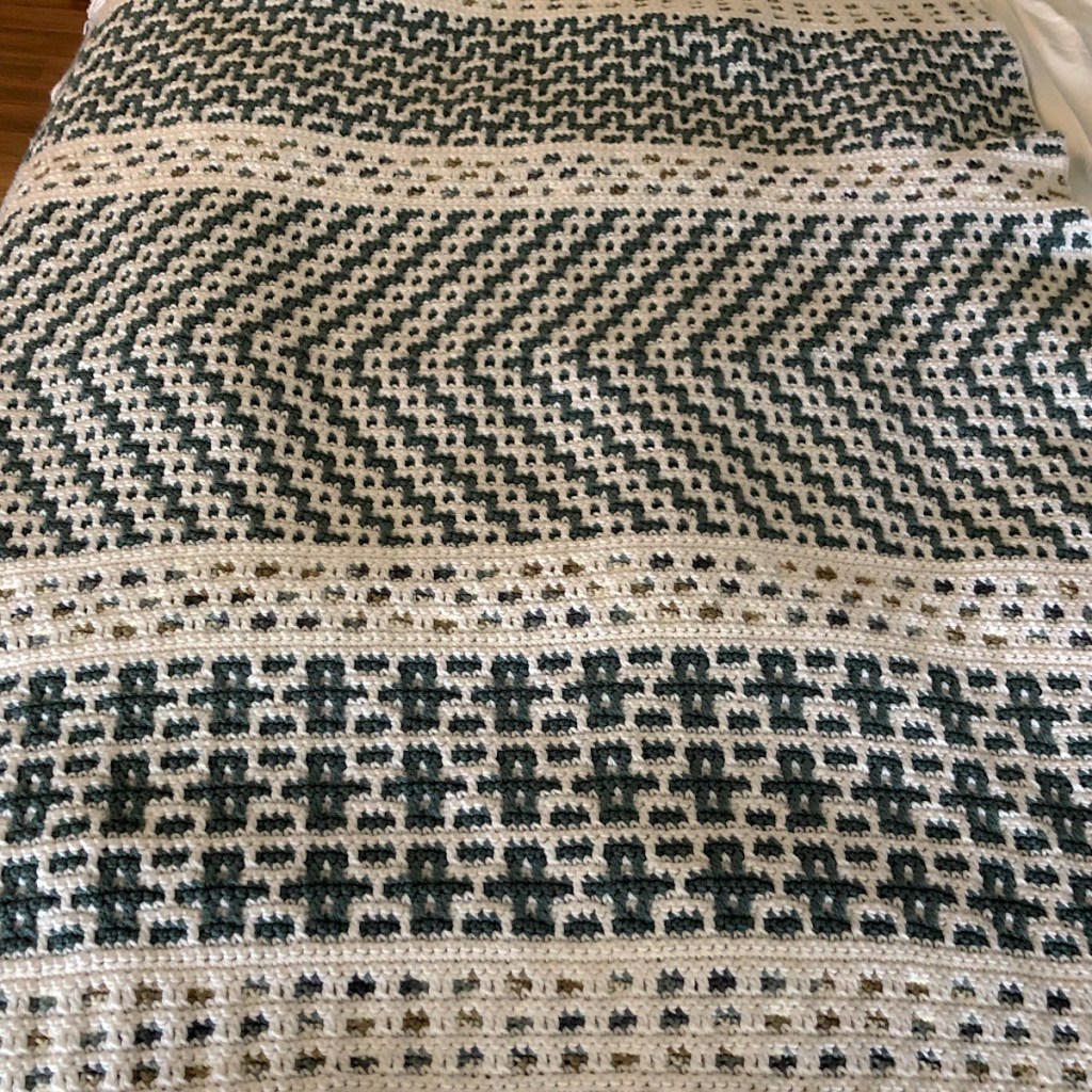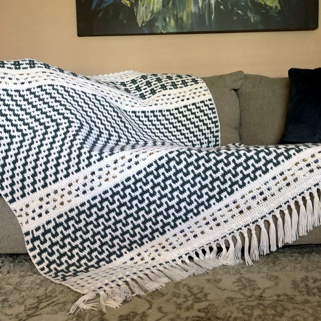 The mosaic technique is fun to do, and once you get the hang of it and the pattern you’re working on, you can really get into that flow of nice rhythmic, meditative crochet. It also allows the project to be worked into one solid piece, resulting in an end product that has a fabric with a tighter weave; Which means a cozy & warm blanket, with no big holes for your toes to stick through!