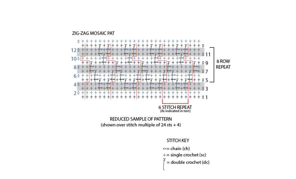 “Mosaic Crochet Patterns are worked in alternating pairs of single crochet (sc) rows, with each pair consisting of a right-side (RS) and a wrong-side (WS) row worked in the same color.”